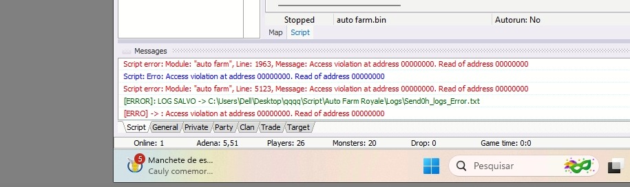 Basicamente ao abrir o script e dar play, nada acontece e o erro é imediantamente exibido:
